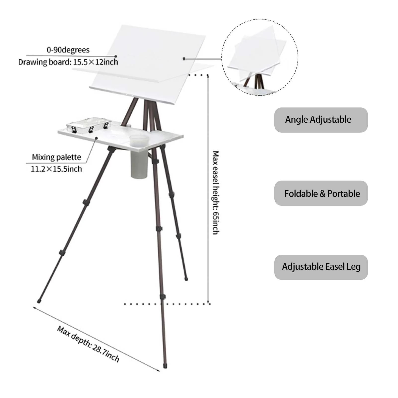 - Foldable Adjustable Bracket: Ranges in height from 17 to 65 inches, with a maximum depth of 28.7 inches. The adjustable easel can be set at various angles, tilted, or erected to meet different techniques. It is easy to disassemble and assemble, features a fixed buckle for easy handling, and has a rubber sole for excellent grip.
